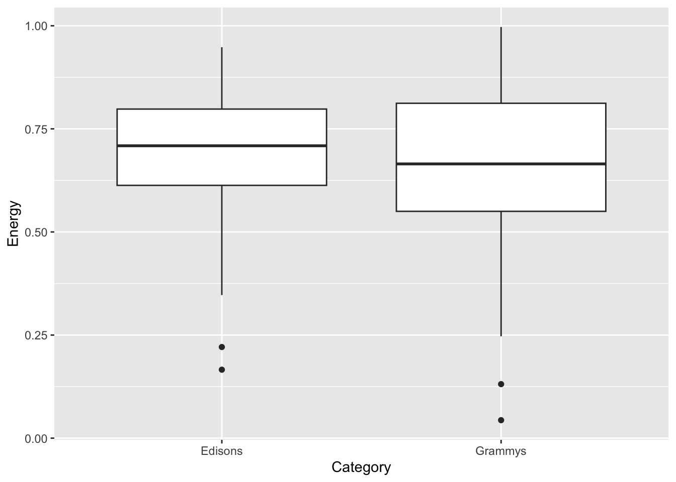 awards |>ggplot(aes(x = Category, y = Energy)) +geom_boxplot()
