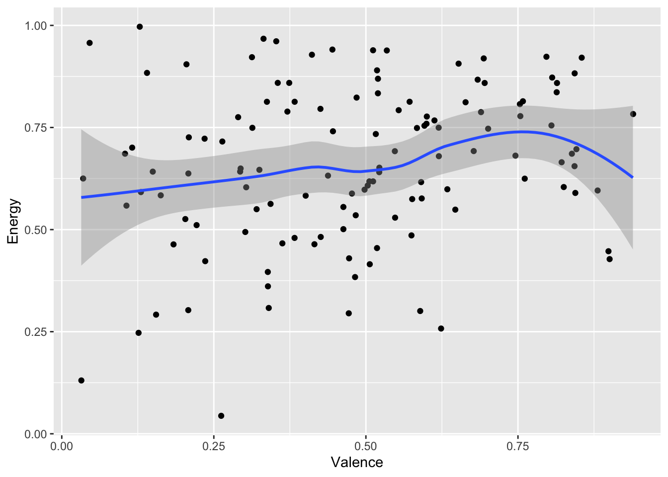 grammy |>ggplot(aes(x = Valence, y = Energy)) +geom_point() +geom_smooth()