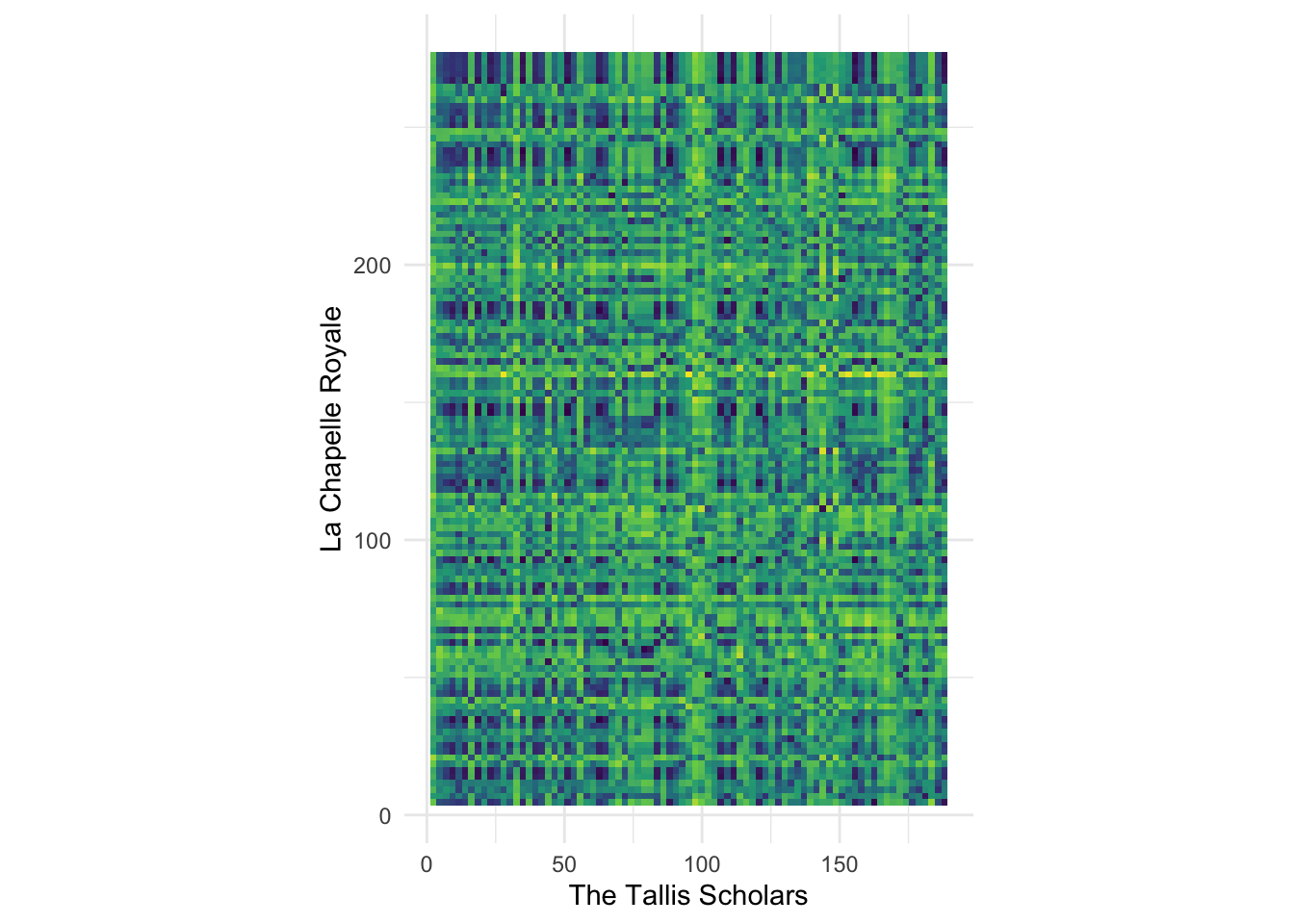 labs(x = "The Tallis Scholars", y = "La Chapelle Royale") +
