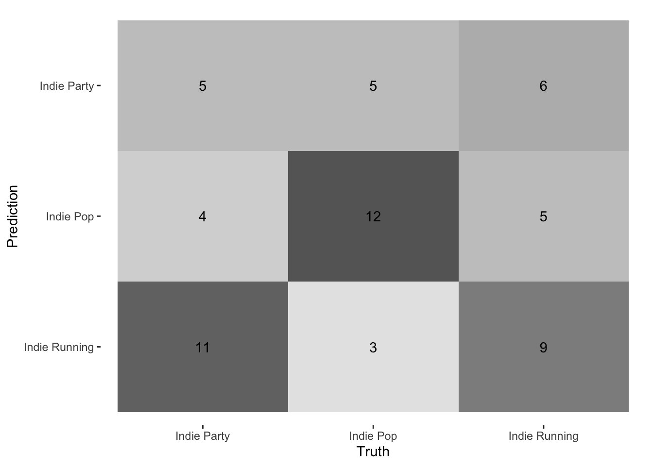 In the tidymodels approach, we can preprocess data with a recipe specifying what we are predicting and what variables we think might be useful for that prediction. For most projects, the track name will be the best choice (although feel free to experiment with others). The code below uses str_trunc to clip the track name to a maximum of 20 characters, again in order to improve readability. The column_to_rownames command is ugly but necessary for the plot labels to appear correctly.