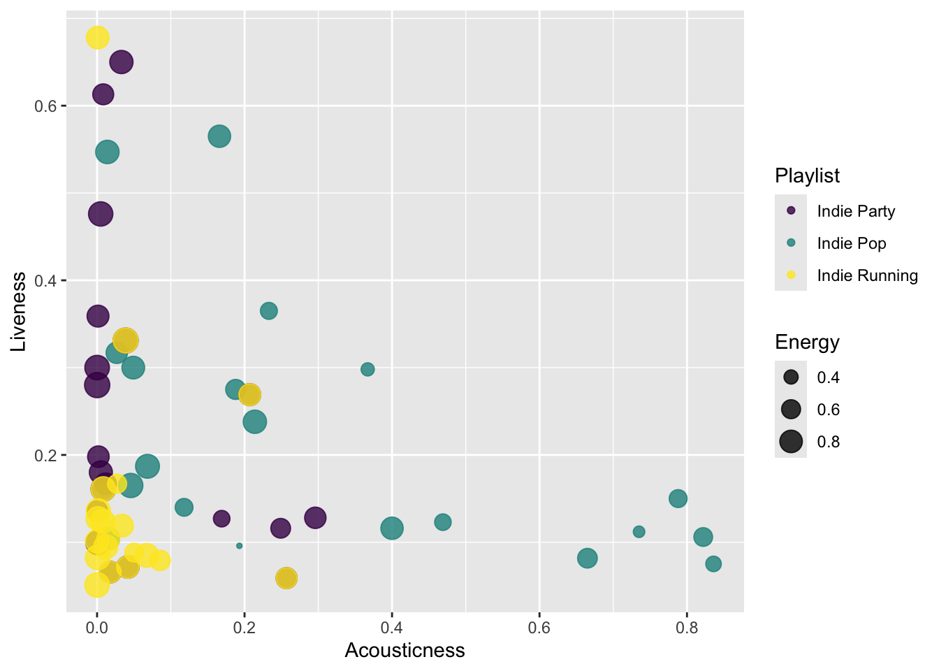 Armed with this feature set, perhaps we can make a better plot. It’s clear that the running playlist is low on acousticness, but the party music overlaps heavily with it and also spreads out into the wider acousticness and brightness range of Indie Pop.