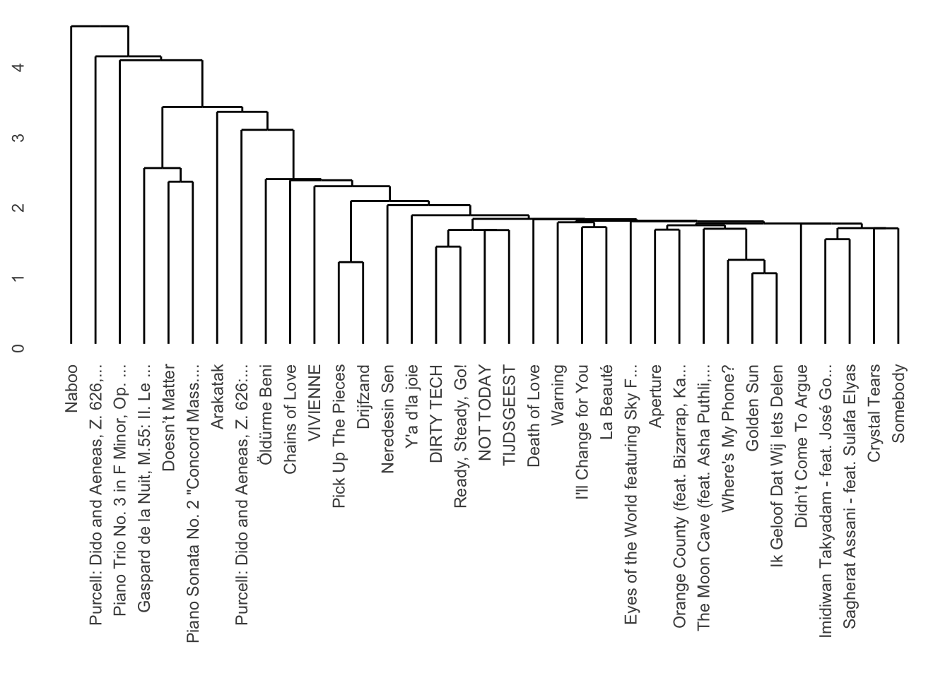 Try all three of these linkages. Which one looks the best? Which one sounds the best (when you listen to the tracks on Spotify)? Can you guess which features are separating the clusters?